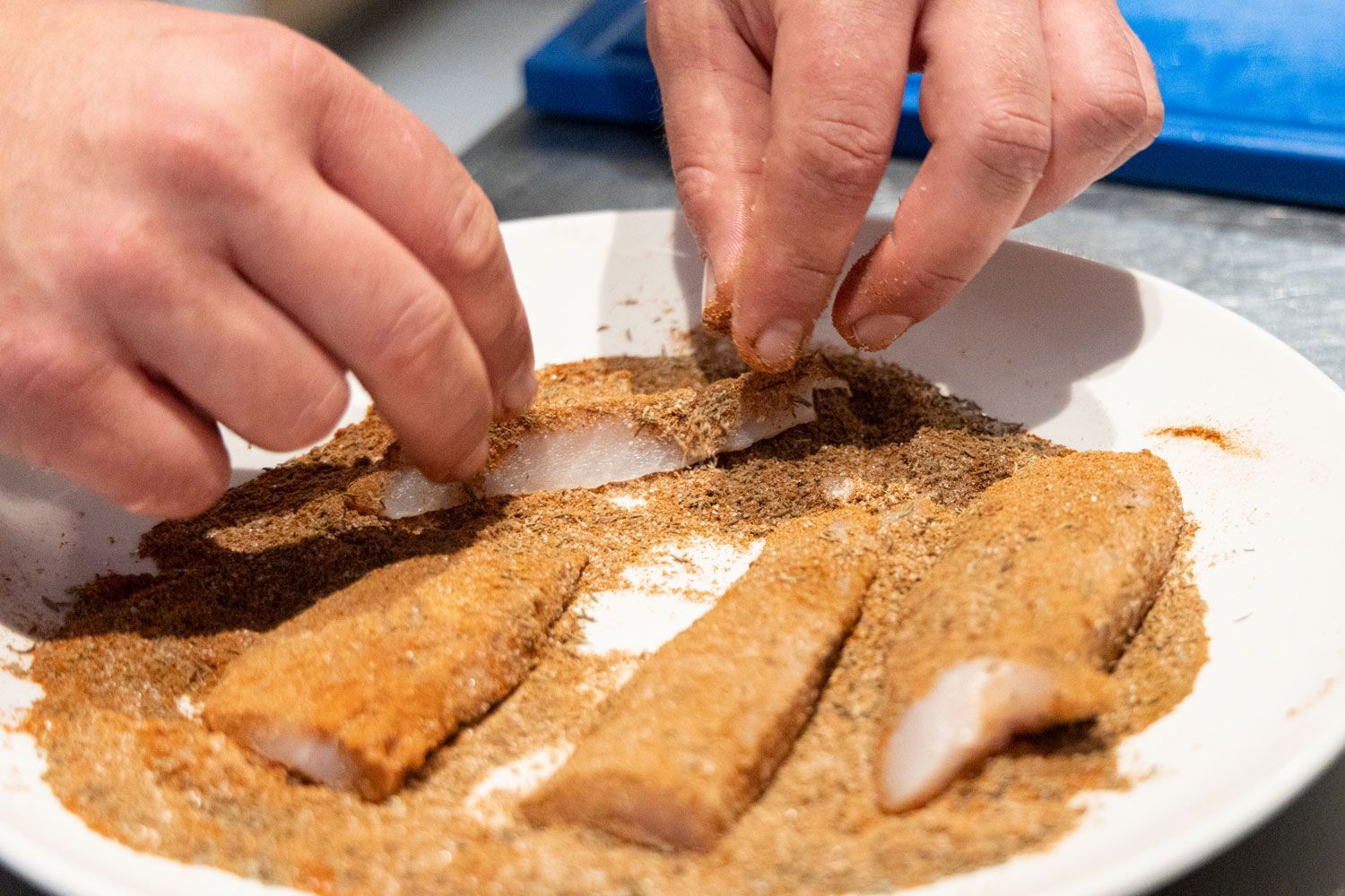 Meng alle kruiden goed en kruid de visfilets ruim. Bak de filets in de boter totdat deze donkerbruin zijn. Vul de tortillas met de gemengde salade en de filets. Maak af met de crème fraiche en peterselie of uw eigen favoriete salsa of saus.